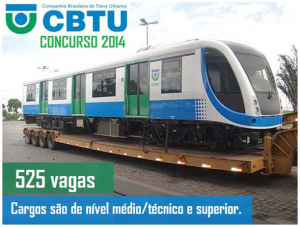 As pessoas que estiverem interessadas em fazer parte do Concurso público CBTU 2014, saibam que as inscrições podem ser feitas pela internet, as oportunidades são para as pessoas com os níveis superior, médio-técnico e médio, com salários básicos que podem chegar a R$ 5.393,72, além de auxílio alimentação de R$ 676,24, reembolso parcial de plano de saúde, entre outros lembrando que as inscrições podem ser feitas através da Consuplan empresa organizadora do concurso quem estiver interessado deve se inscrever até o dia 22 de abril 2014terao que pagar uma taxa no valor de R$ 12,50 a R$ 33,80, dependendo do cargo pretendido.